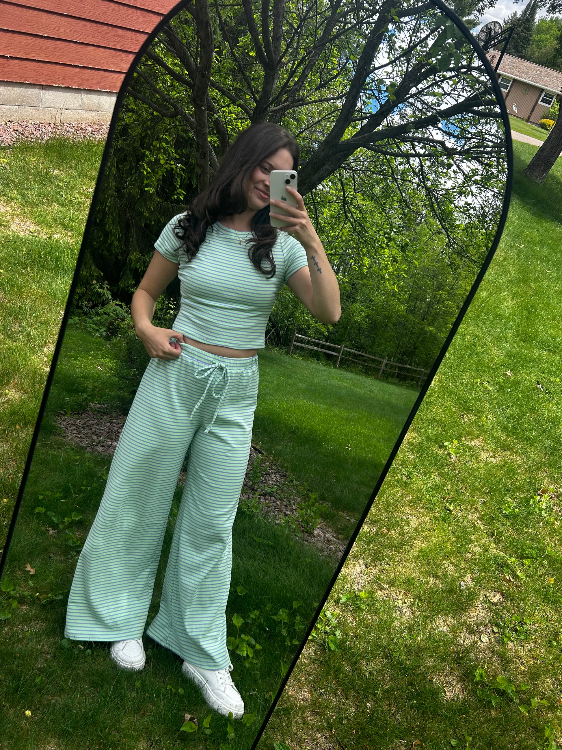 Stripes and matching sets are on trend this year so why not combine them? This adorable matching set features a baby tee and flare pant set in a fun mint and lavender color-way.